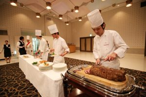 お色直しの中座中には皆様へのお肉料理を会場内でカットする演出も!